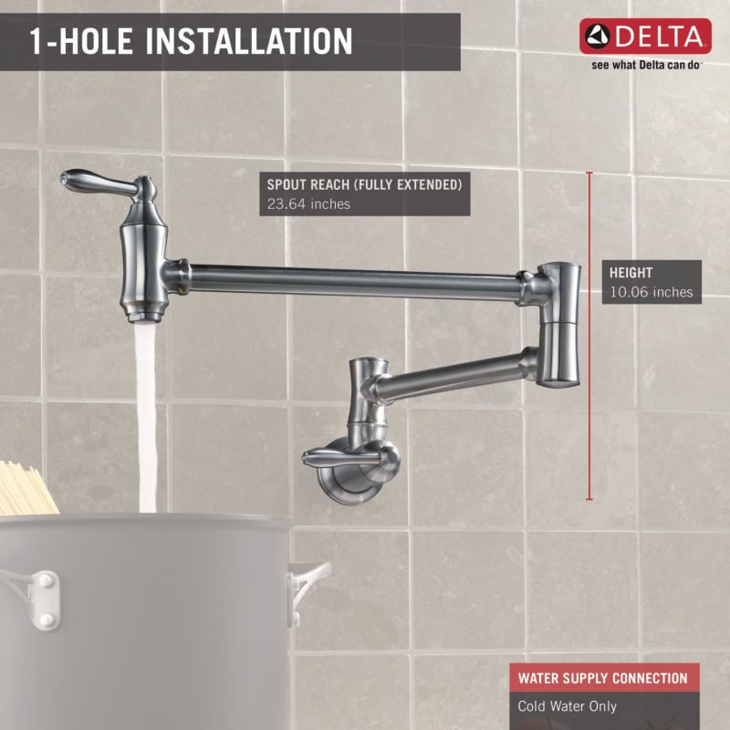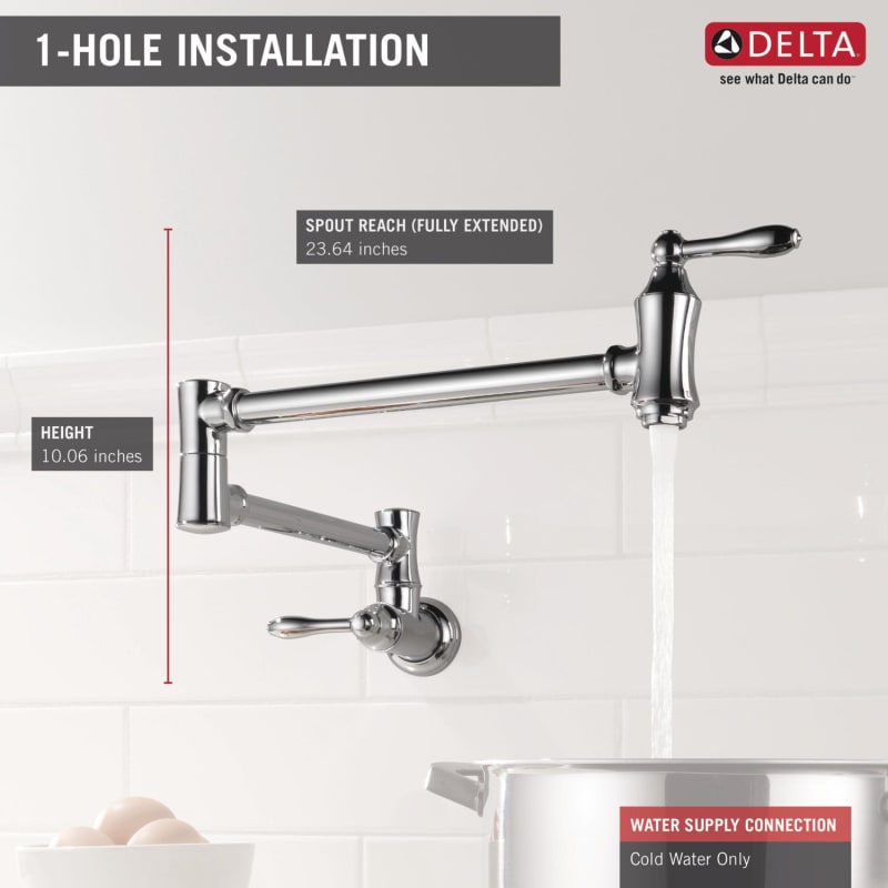 Delta 1177lf Chrome Traditional Wall Mounted Pot Filler With Dual Swing Joints And 24 Extension Includes Lifetime Warranty Faucetdirect Com